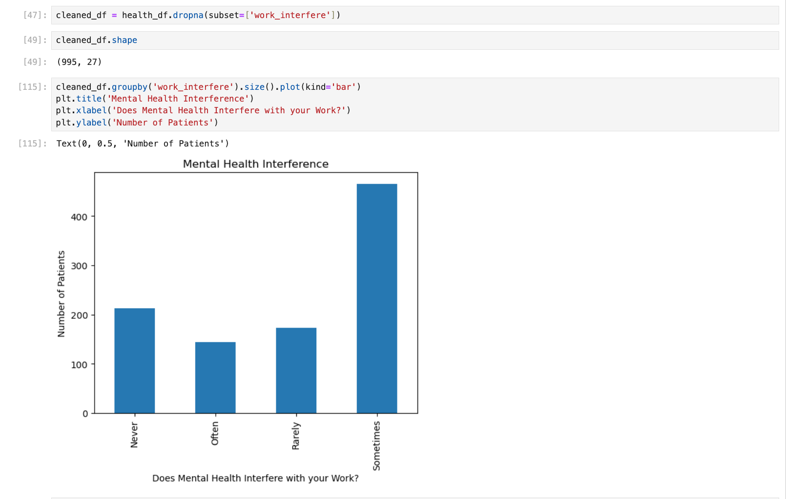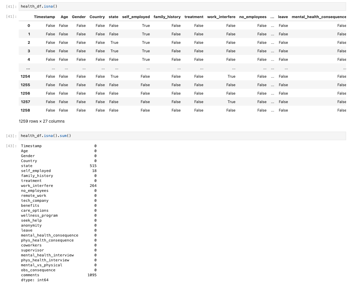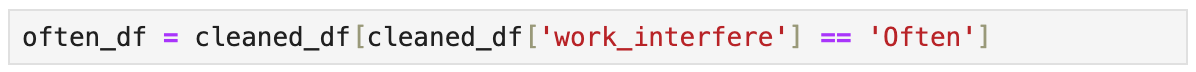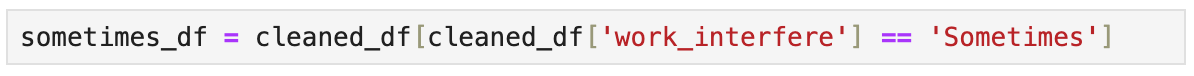First I found all of the Null values for the work-interference column because I am only working with those who have mental health work inteference so all other data is obsolet.