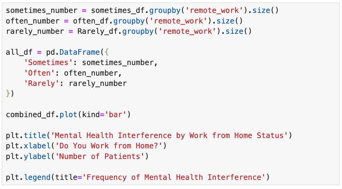 The graph shown above from the data set shows that the group that often, Rarely, and sometimes feels mental health interferes with their work and their answers to wether they work at home or not at least 50% of the time. The data shows that most people who have mental health problems that interfere with their work are often people who go into the office and do not work from home.