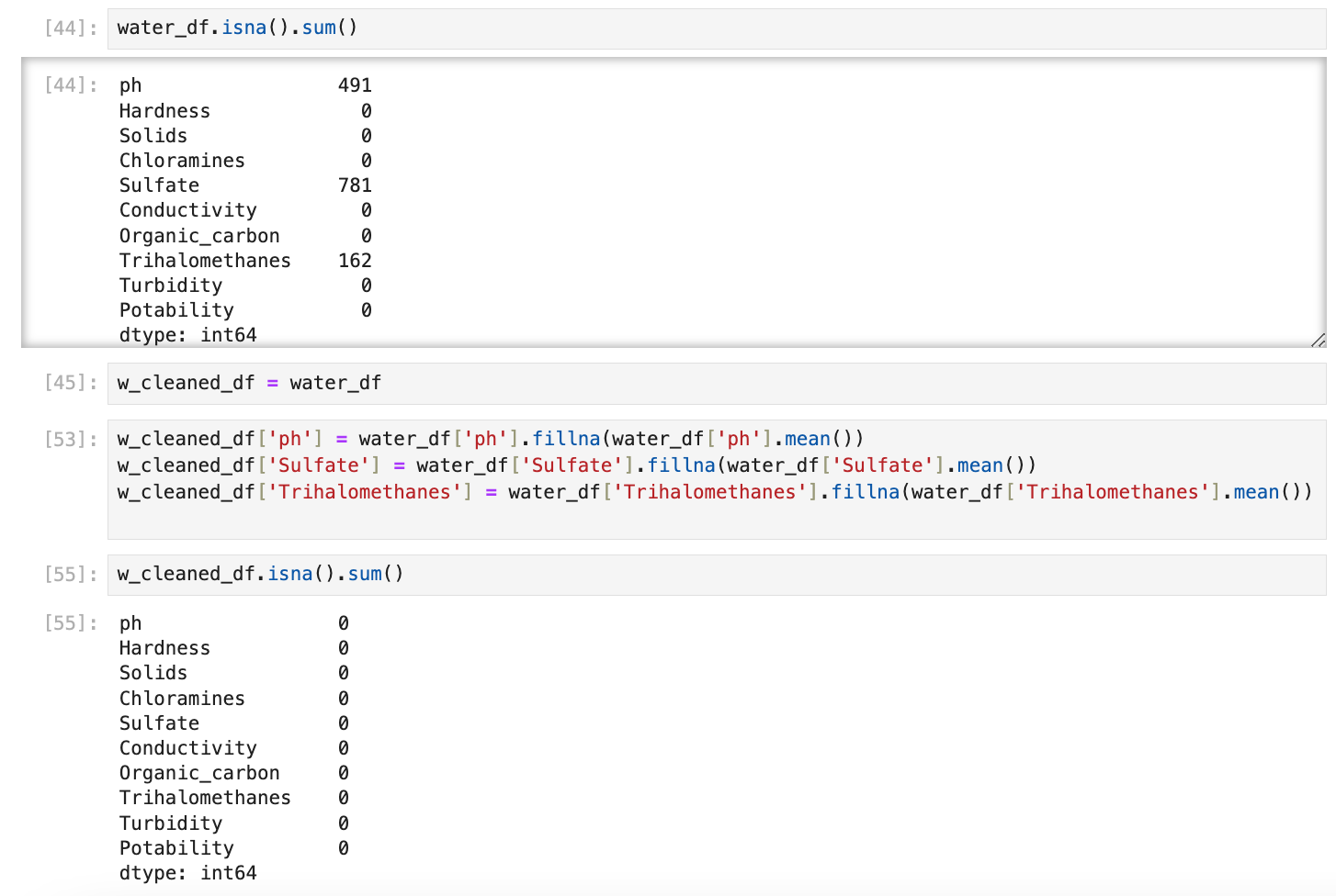 Missing Values: First I found out all of the missing values in the columns using .isna().sum() on the database. That resulted in revealing that ph, sulfate, and Trihalomethanes all had missing values. To compensate for this problem we filled their respective mean values in the missing data to prevent disproportions in the data within a new database called w_cleaned_df.