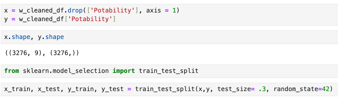 Train-Test-Split: For the models to function they need training data. If the goal is to train the models to find out if water is potable or not we split the data up based on that column. Then used sklearn to divide the data into training sets and testing sets. I set a random state parameter so that results remain consistent.